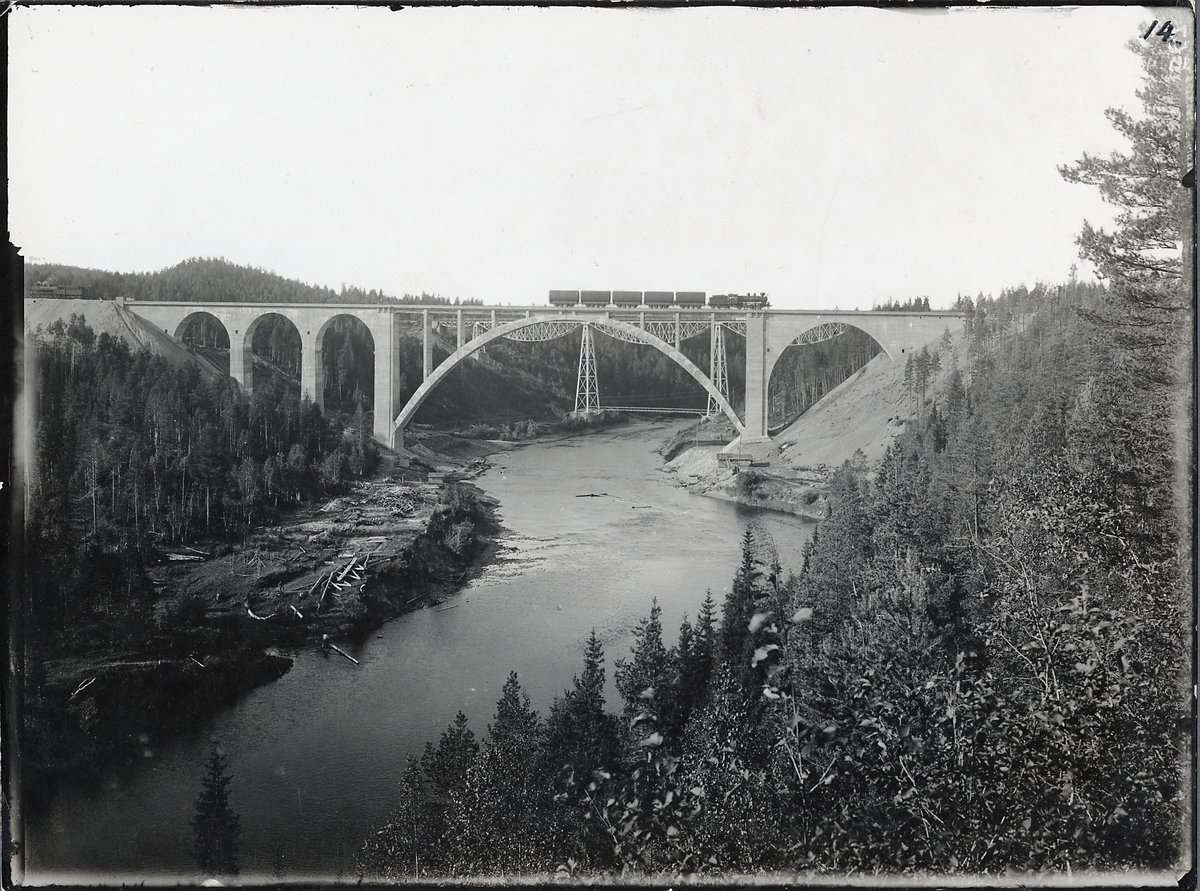 Järnvägsbron över Öreälven. På bron ett lok med provbelastningsvagnar.