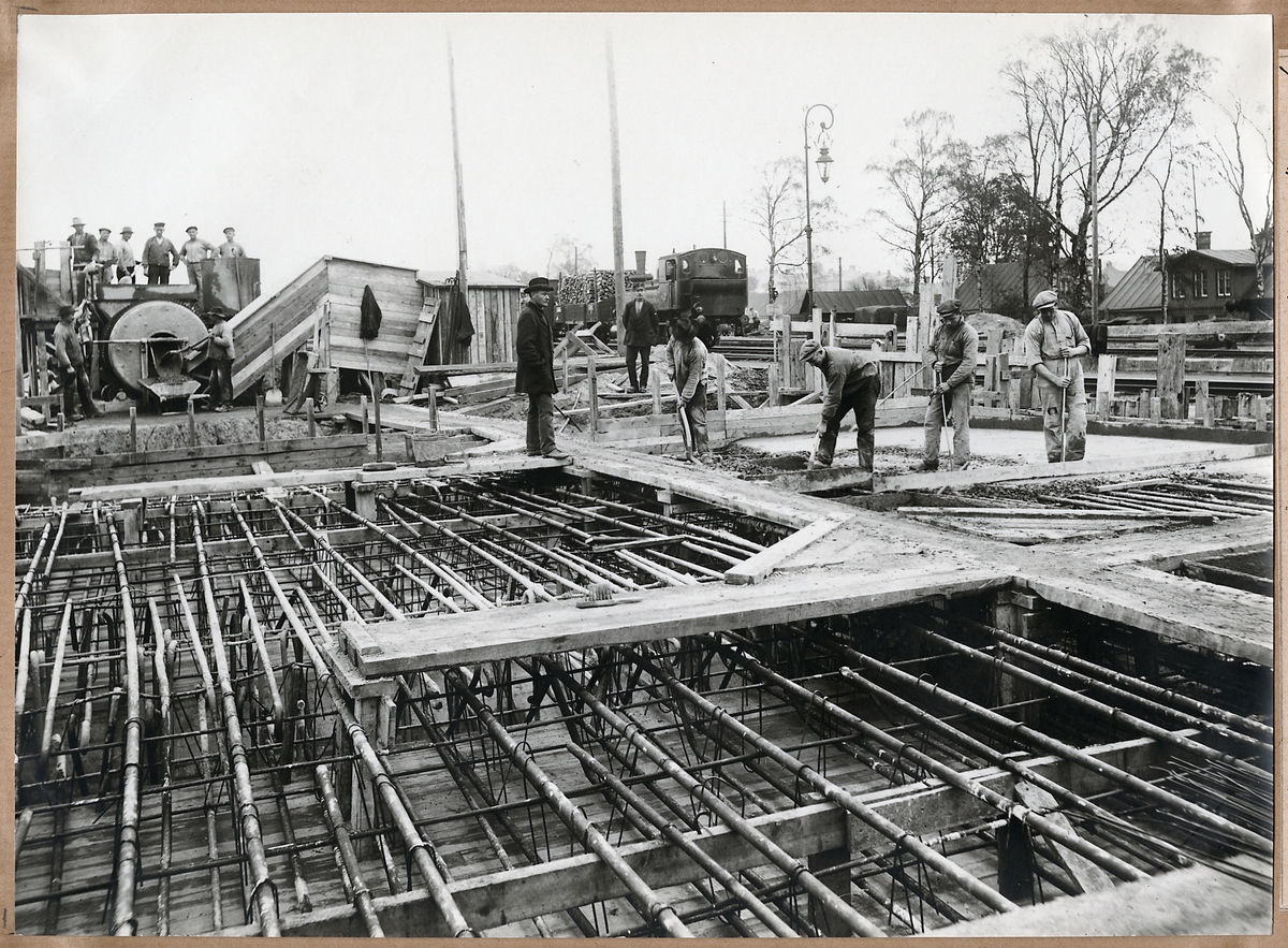 Gjutning av brodäcket till vägport av järnbetong i Tredje Avenyen, Hässleholm. November 1917.