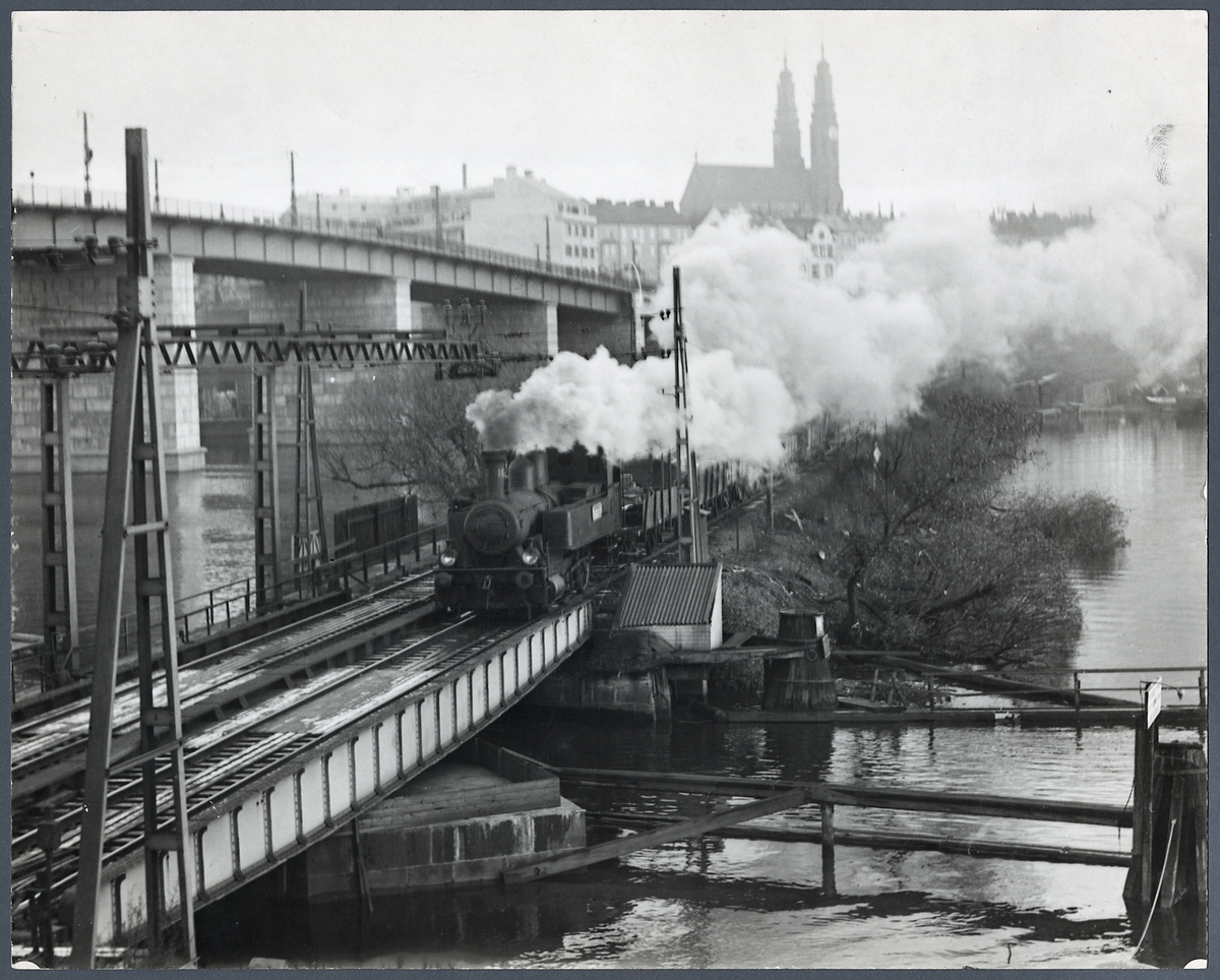 Liljeholmsbron. Godståg med Statens Järnvägar, SJ Ke som dragkraft.