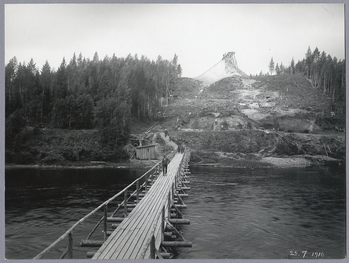Västra stranden med påbörjade schaktningar för landfäste och pelare för järnvägsbro över Öreälven.