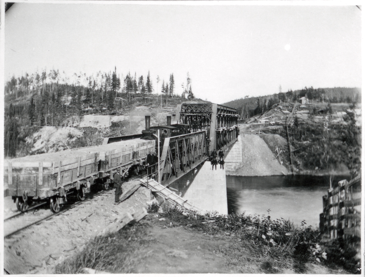 Banbyggnad. På bilden ser man 2 SJ OC ånglok med 2 lastade godsvagnar.