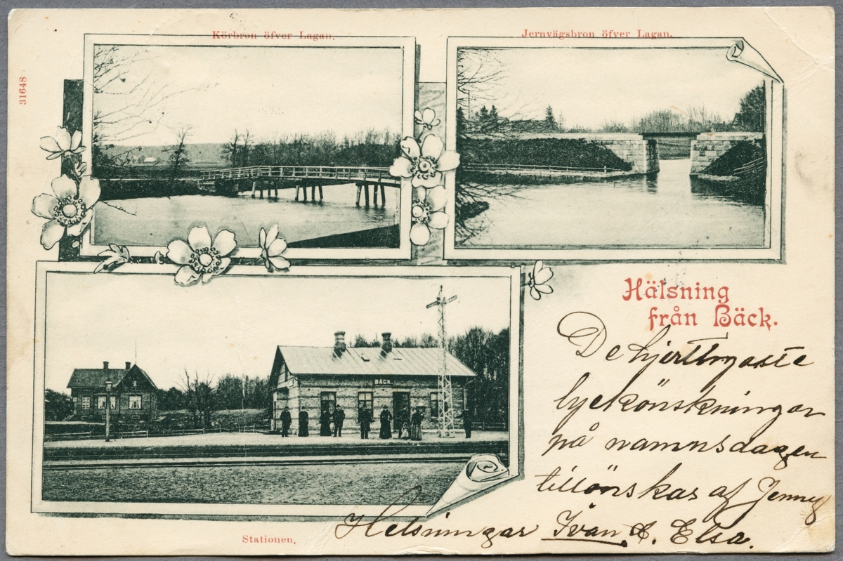 Järnvägsstationen i Bäck samt bil- respektive järnvägsbron över Lagan.