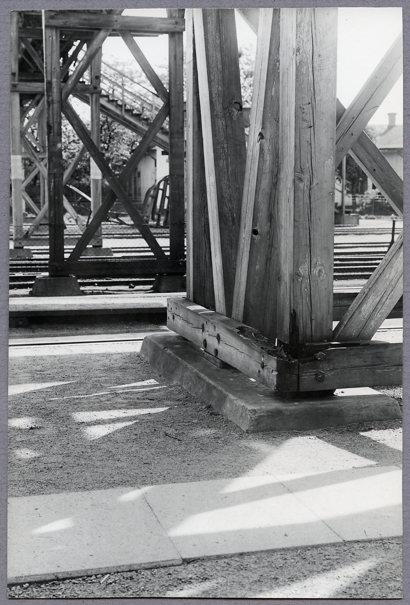 Gångbro av trä över bangården i Stenstorp. Bock på stamplattform. Rötangrepp i bockben och nedre horisontella förband.
