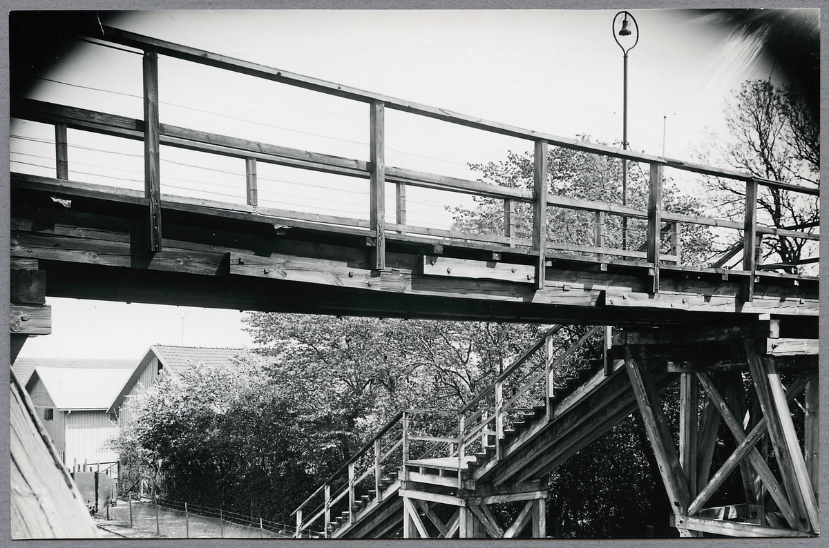 Gångbro av trä över bangården i Stenstorp. Spannet längst från stationssidan.