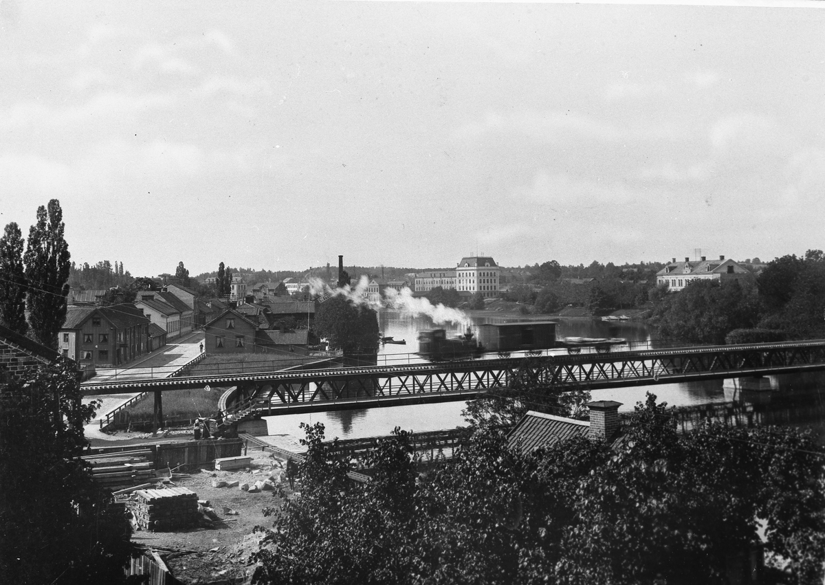 Här låg tidigare kyrkbron, men den revs i samband med att Norra Södermanlands järnvägsaktiebolag byggde järnvägsbron. För att ersätta kyrkbron så byggdes då också gångbron som syns här närmast i bild.