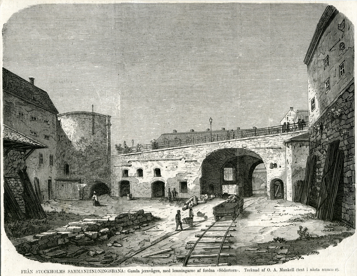 Från Stockholm sammnbindningbanan, gamla järnvägen med lämmnigar av fordna, (södertorn) tecknad av O. A. Mankell.