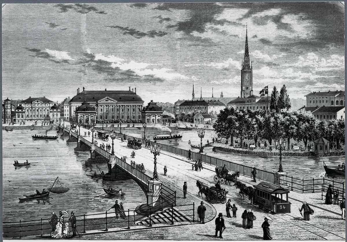 Stockholmsbild. Det Stockholm som kommit: Vasabron mellan Tegelbacken och Riddarhusgränd. Tecknad av Otto August Mankell.