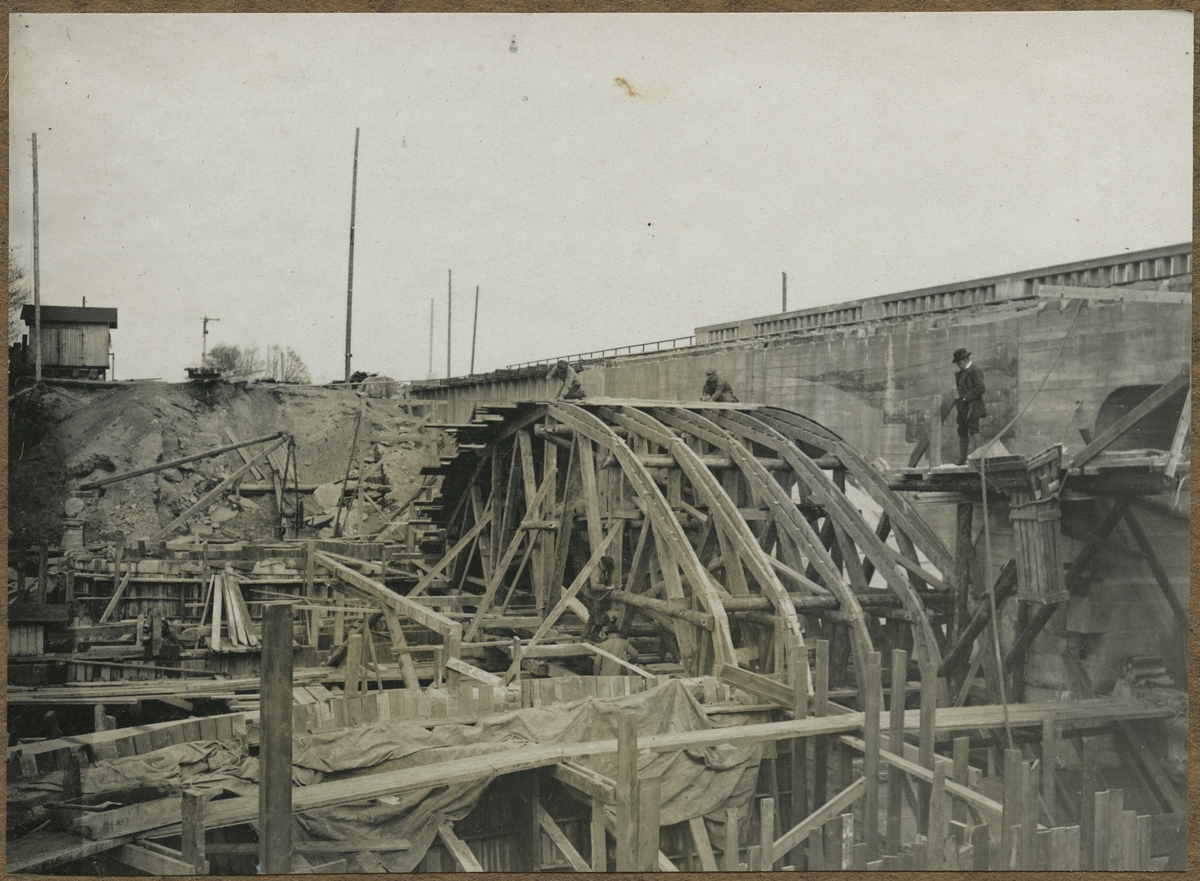 Dubbelspårsbyggnaden mellan Alingsås - Olskroken. Bron över Säveån ställningar för norra brohalvan.