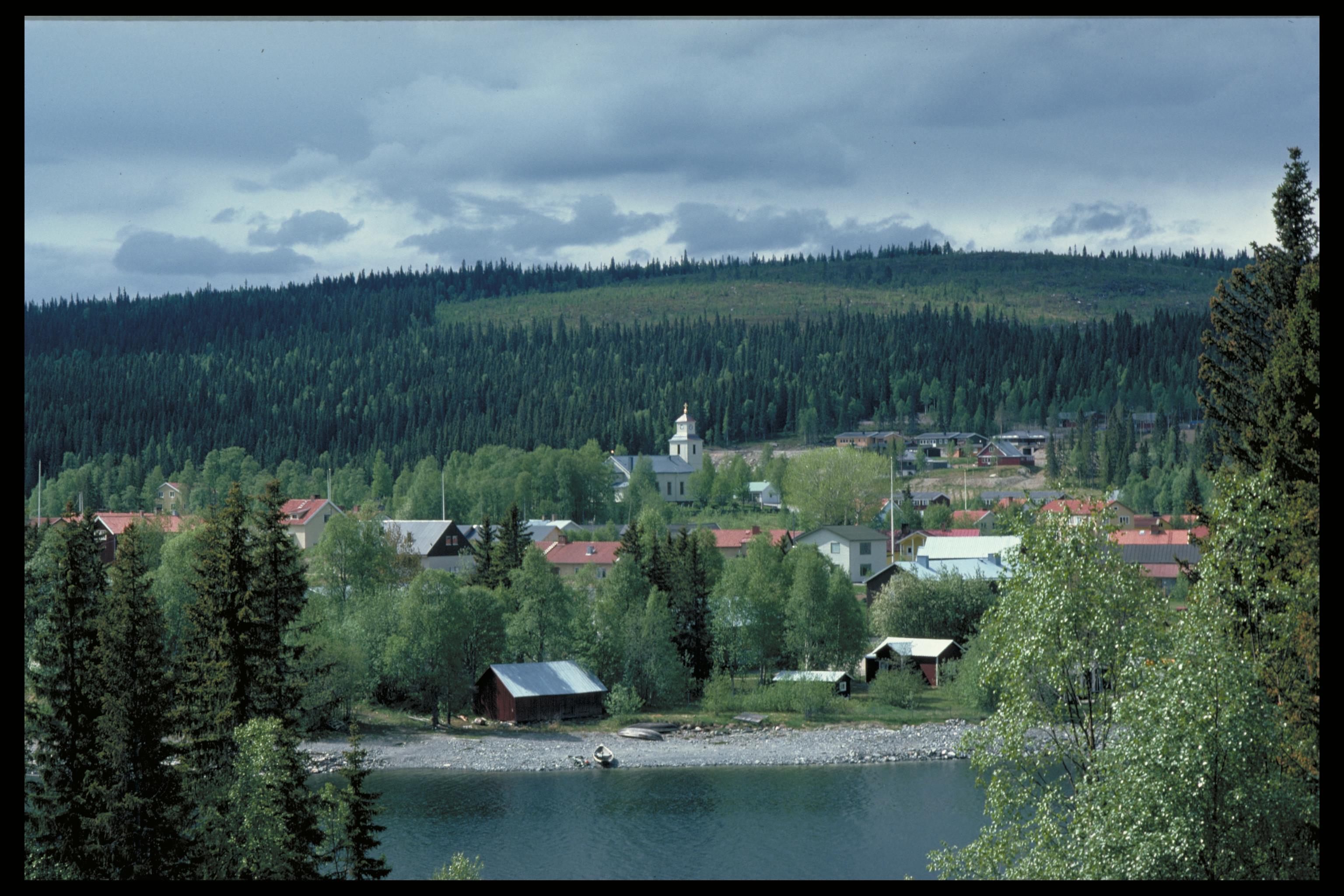 Frostvikens (Gäddede) kyrka i bildens mitt. Bilden troligen från mitten av 1970-talet.