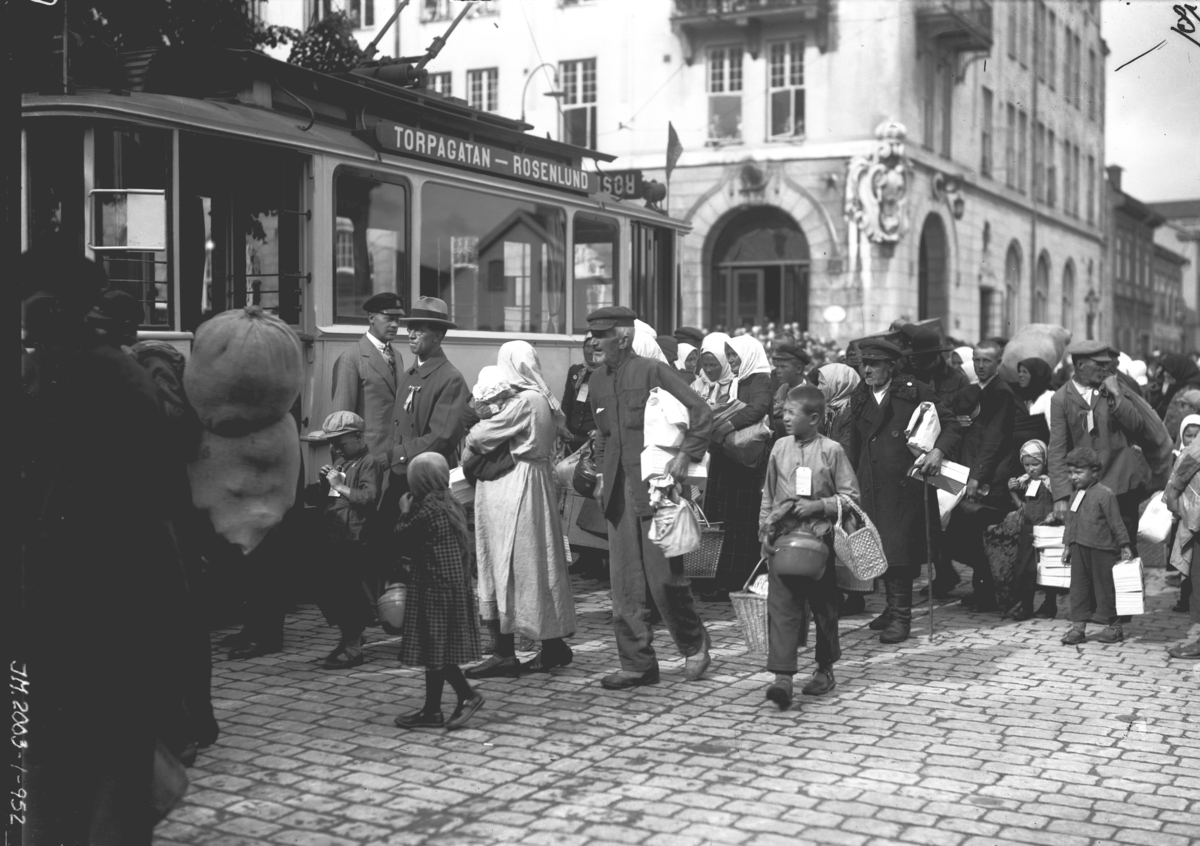 Svenskbybornas ankomst till Jönköping. Efter tågresan färdades man med spårvagn och bil till Ryhovsområdet i Jönköping för inkvartering i I 12:s gamla kasernbyggnader.