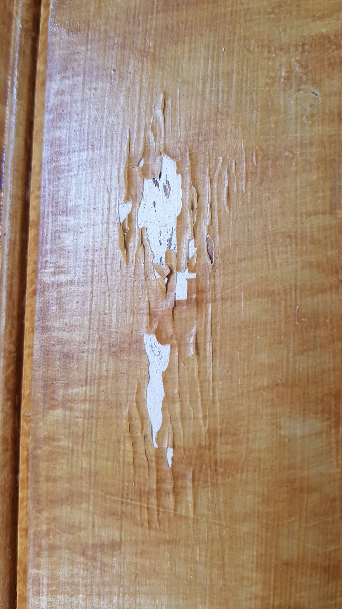 Rönnhults missionshus, salen. Västra väggen med spjälkande färgskikt. Före åtgärd.
