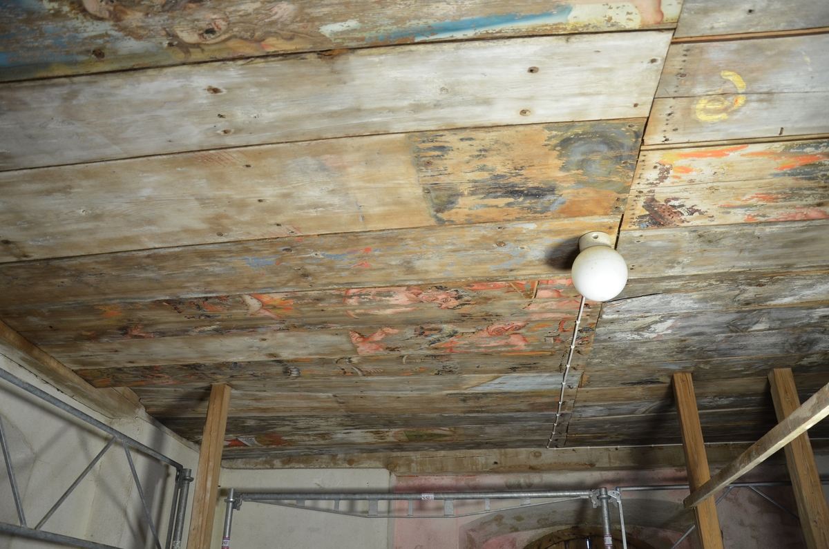 Rogberga kyrka. Fragmentarisk äldre takmålning från gamla kyrka, sedan 1867 i nya kyrkans torn. Översikt efter konservering.