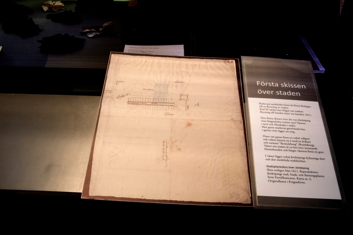 Stadshistoriska utställningen i arkivhuset. Stadsplaneskiss över Jönköping, troligen från 1611. Reproduktion. Originalkarta finns i krigsarkivet.