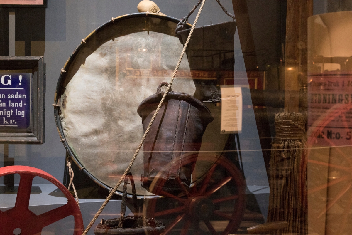 Stadshistoriska utställningen i arkivhuset. Svabbel, Jönköpings brandkår. Ämbar i läder, Jönköpings brandkår.