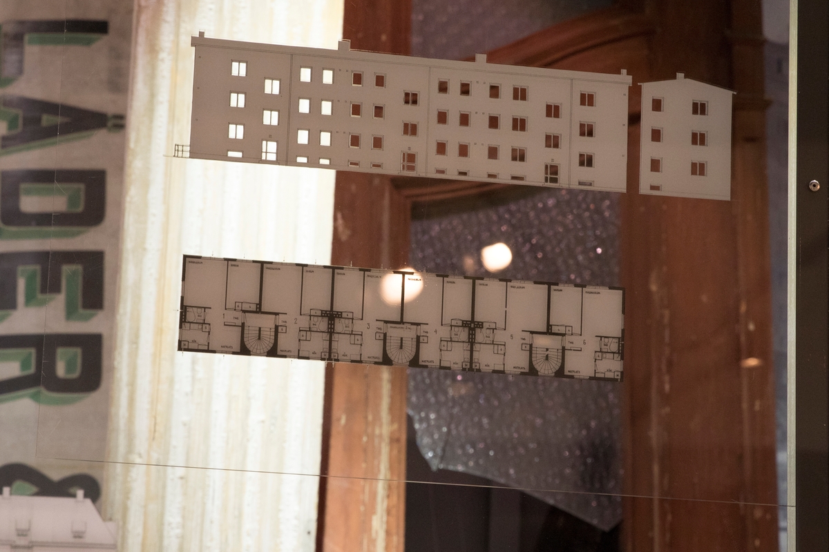 Stadshistoriska utställningen i arkivhuset. Reproduktion av ritning av kvarteret Lärkan 2. Stadsplanen för Söder omarbetas 1936, och stadsdelen byggs fritt liggande smala huskroppar med putsad fasad.