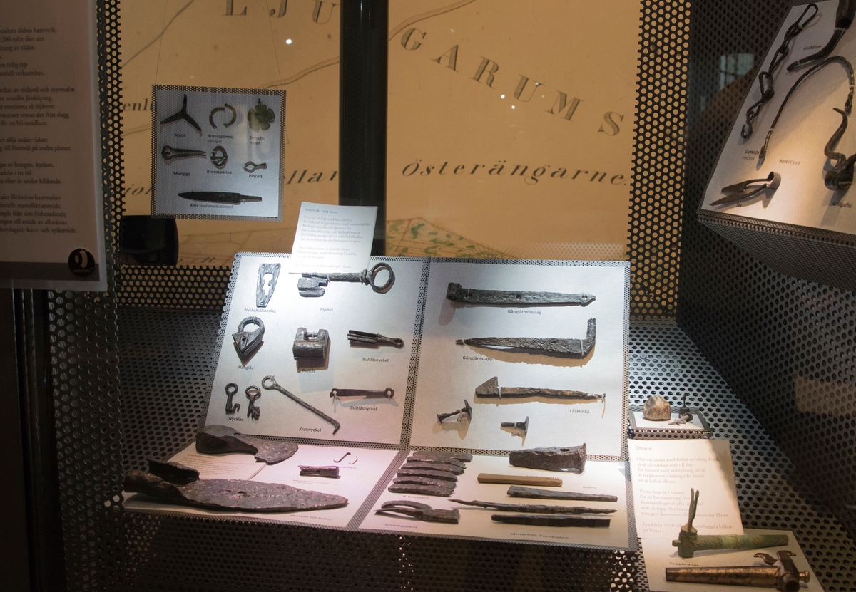 Stadshistoriska utställningen i arkivhuset. Järnfynd inom lås och bom. Fynd från medeltidsstaden på väster i Jönköping.