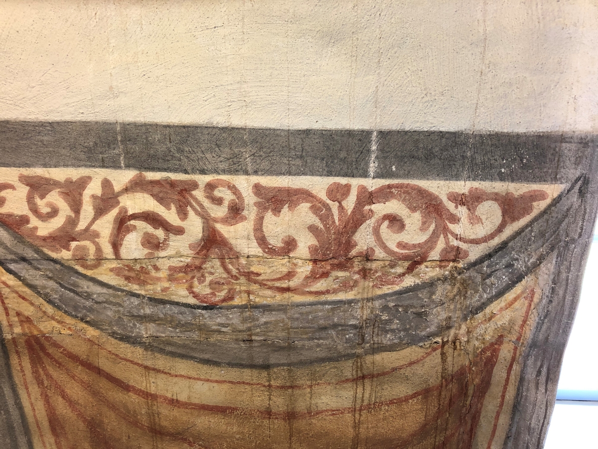 Alvesta kyrka, Kronobergs län. Senmedeltida kyrka från slutet av 1500-talet. Interiören har väggmålningar från 1500- och 1600-talen. Väggparti med del av draperimålning och odekorerad yta. Missfärgningar har delvis tagits bort, rengöring pågår.