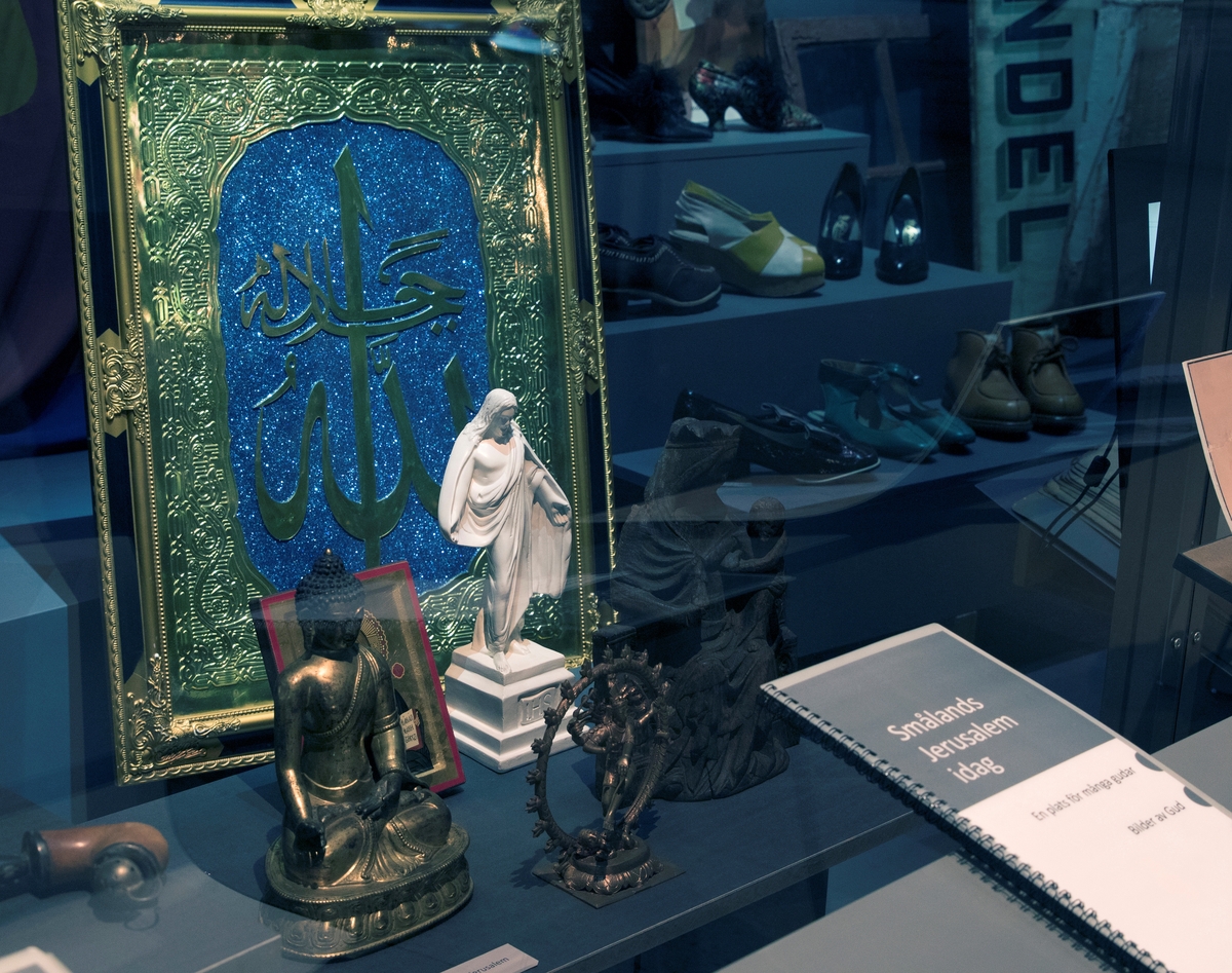Stadshistoriska utställningen i arkivhuset. Bilder av Gud i Smålands Jerusalem. Invandringen till Sverige, som ökade efter andra världskriget har resulterat i att alla världsreligioner idag finns i Jönköping. Guden Shiva, Buddha, Maria med Jesusbarnet med flera.