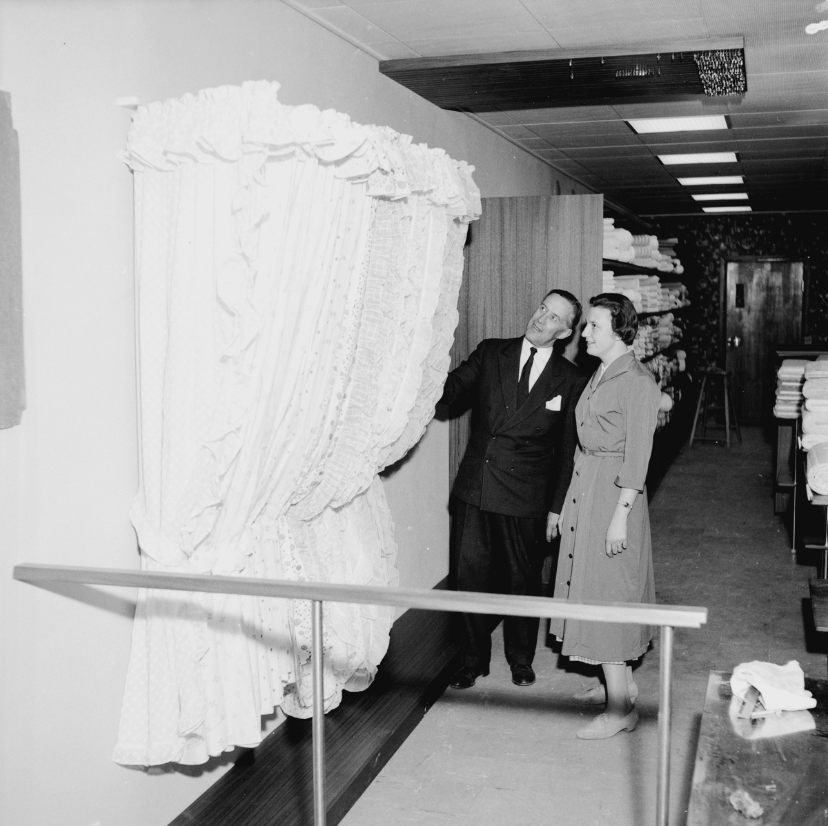 Textilavdelningen på Konsum i Huskvarna, en kvinna och en man står och tittar på en gardin.