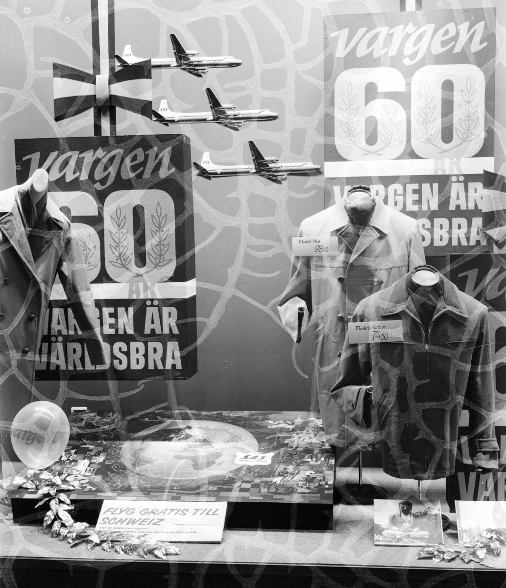 Skyltfönster på varuhuset Konsum Union i Huskvarna. Skyltning Vargen 60 år, en tävling man kan vinna en resa till Schweiz.