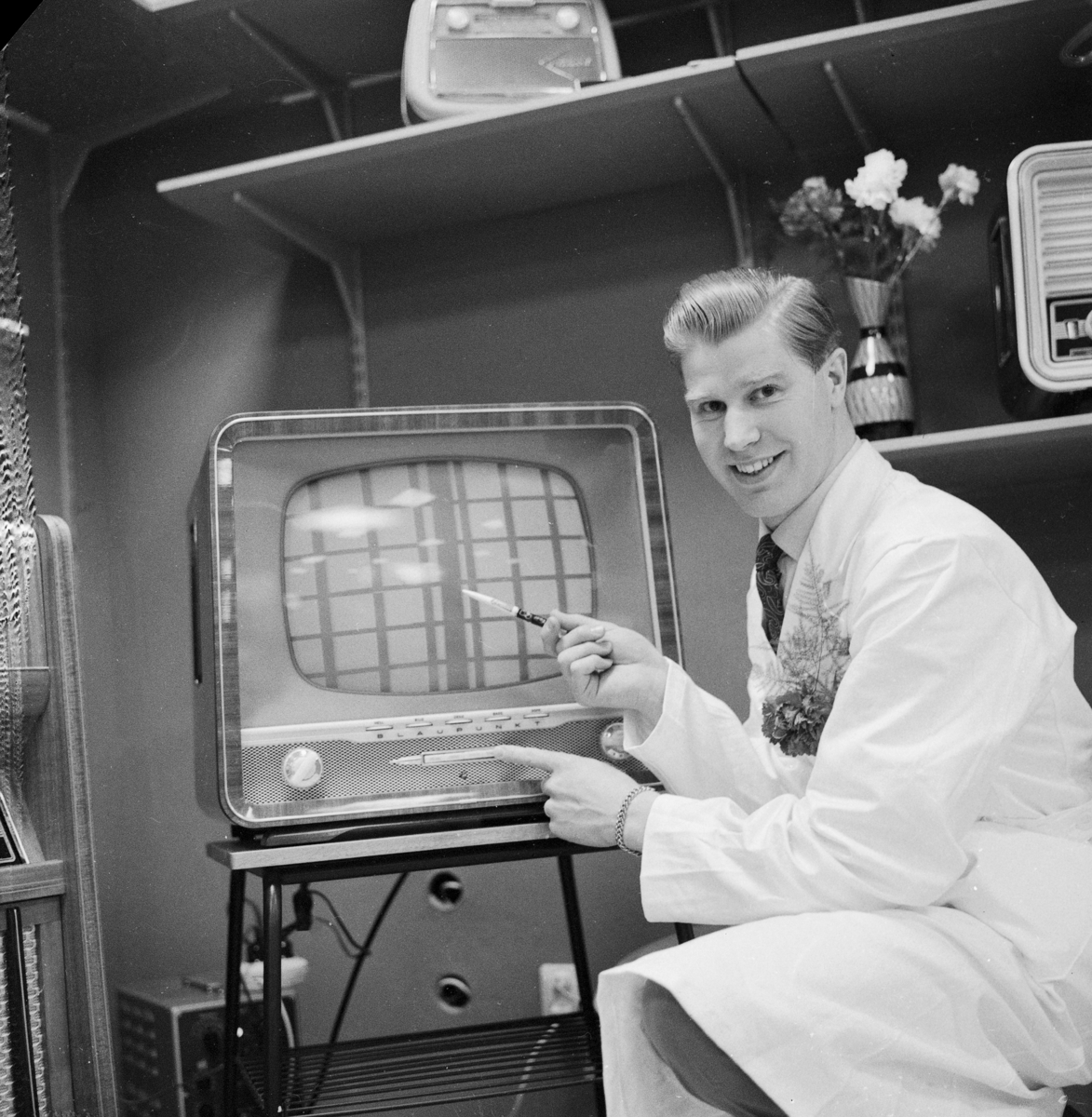 En man sitter vid en TV apparat på Radio och TV avdelningen på Konsum varuhuset i Huakvarna.