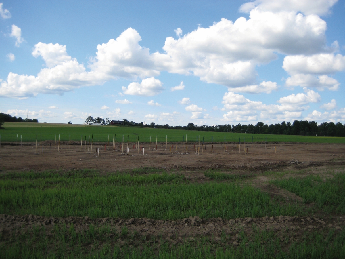 Långhus från äldre järnålder framkomna vid en arkeologisk undersökning i Rogberga utanför Jönköping. På bilden syns käppar med olika färger som markerar stolphålen efter tre långhus samt ett mindre fyrstolpshus.