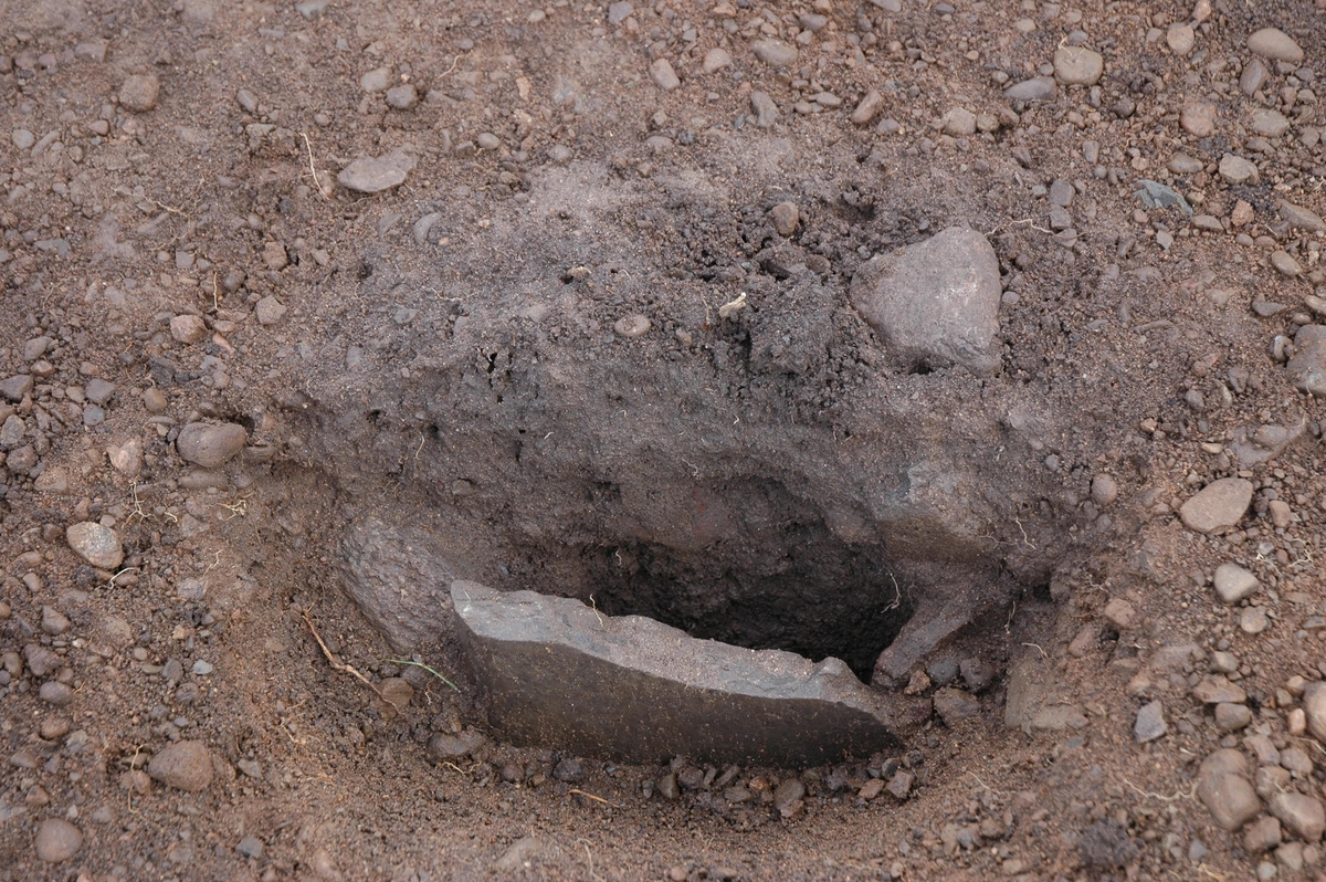 Ett stenskott stolphål, hörande till ett ca 8 meter långt och 5 meter brett fyrstolpshus daterat till folkvandringstid. Huset framkom vid en arkeologisk undersökning i Rökinge på Visingsö.