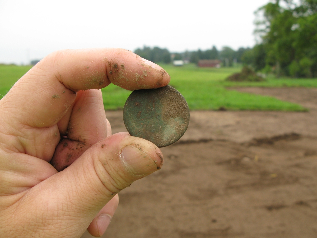 Ett nyupptaget mynt från 1700-talet. Metalldetekteringsfynd gjort vid en arkeologisk undersökning i Odensjö i Barnarp socken i Jönköpings kommun.