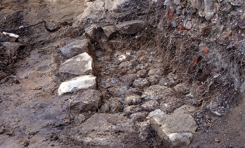 Bottenlagret på en keramikugn påträffad vid en arkeologisk undersökning inom kvarteret Dromedaren i centrala Jönköping. Lagret bestod av en stenläggning och runt denna hade en stenram lagts ut. Botten var täckt av lera.