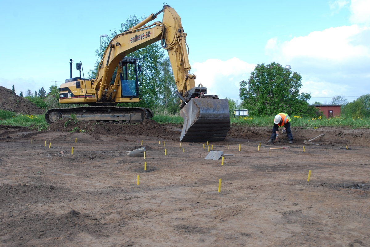 En arkeolog arbetar vid grävmaskinen och i förgrunden finns anläggningar markerade med gula pinnar. Foto taget vid en arkeologisk undersökning i Gränna 2009.