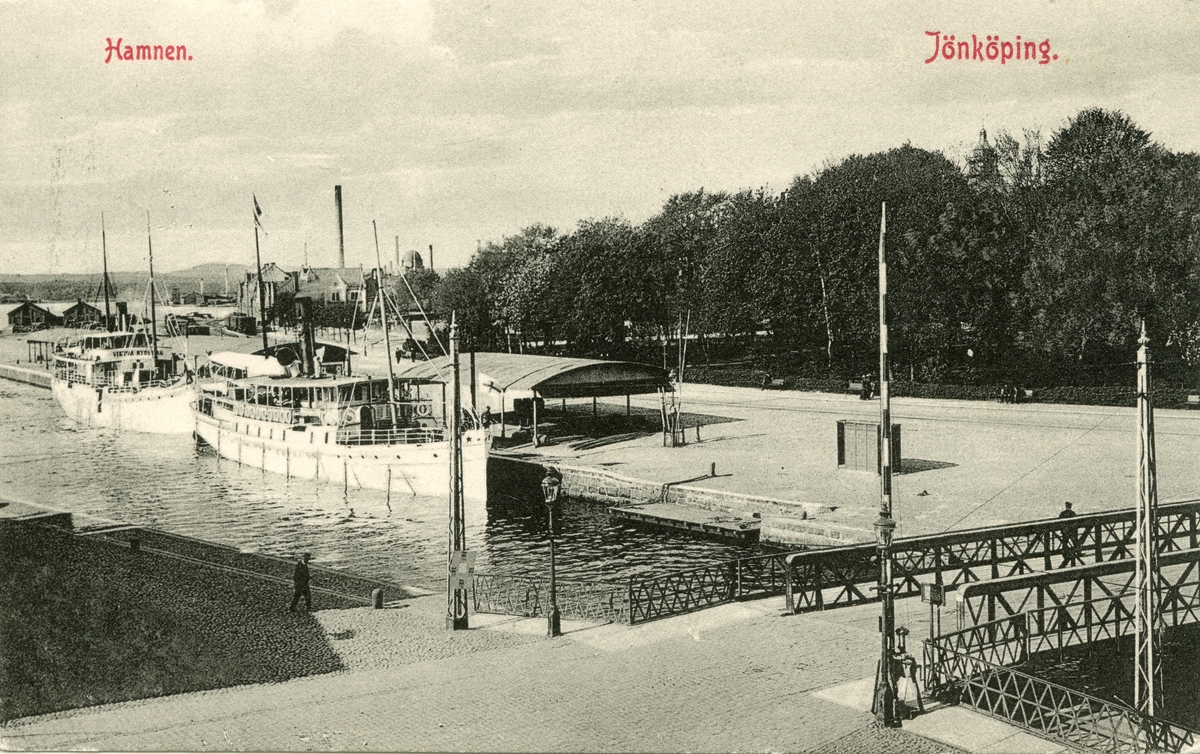 I hamnkanalen mellan Munksjön och Vättern ligger två båtar förtöjda, Motala Express och Viktor Rydberg. I förgrunden Södra svängbron.