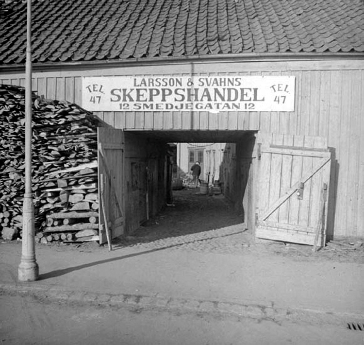 Larssons & Svahns Skeppshandel med adress Smedjegatan 12 i Jönköping. Portgången och gården är kullerstensbelagd och en stor vedstapel ligger utmed Södra Strandgatan, där bilden är tagen.