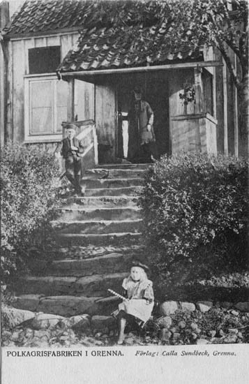 Polkagrisfabriken vid Brahegatan i Gränna. Amalia står i dörren på trappan framför huset.