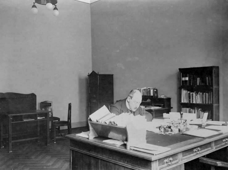 Jönköpings högre allmänna läroverk. En man sitter vid skrivbordet och arbetar.