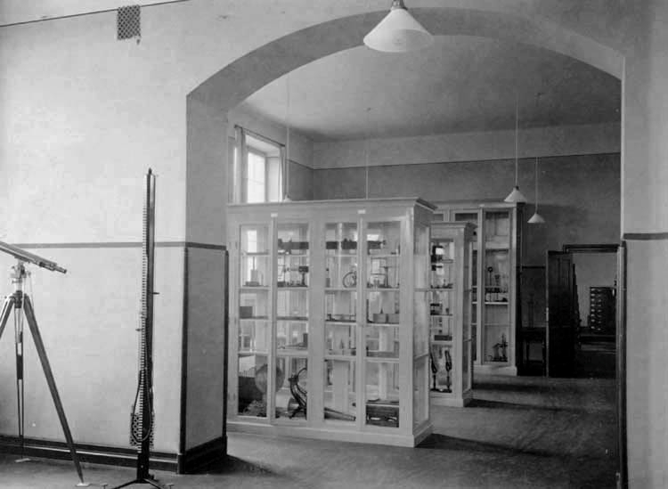 Jönköpings högre allmänna läroverk med samlingar i höga klasskåp.
