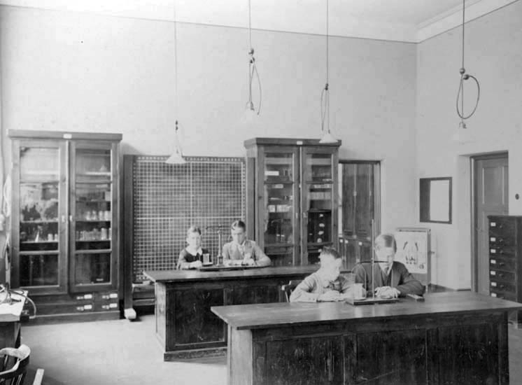 Jönköpings högre allmänna läroverk. I ett klassrum har några elever har en våg framför sig på bänken och gör en laboration.