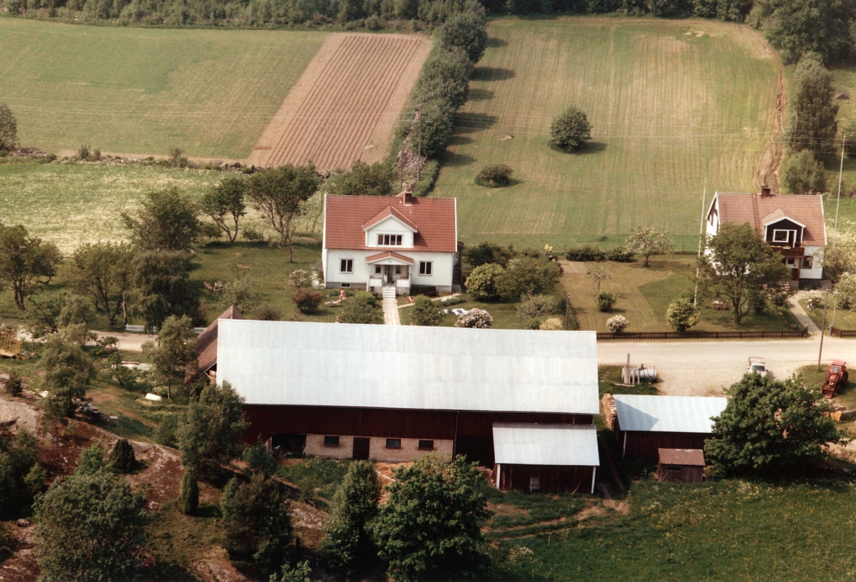 Flygfoto över fastigheterna Slagetorp 2 till höger Slagetorp 1