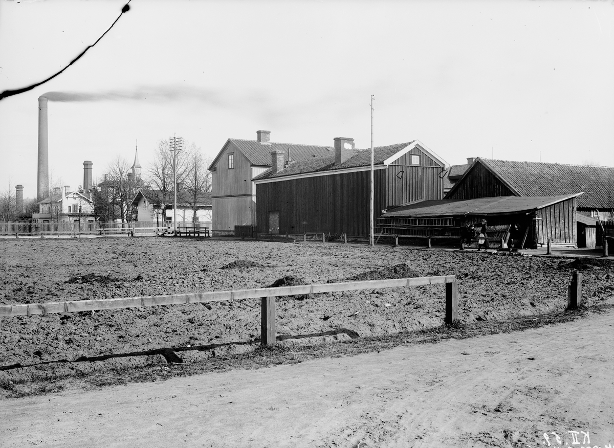Nyslätt, Barnarpsgatan 74, mittemot Munksjöfabriken i Jönköping. I bakgrunden syns fabrikens skorstenar och disponentvillan. Fastigheten ägdes av förre Munksjödisponenten Ottonin Ljungqvists sterbhus.