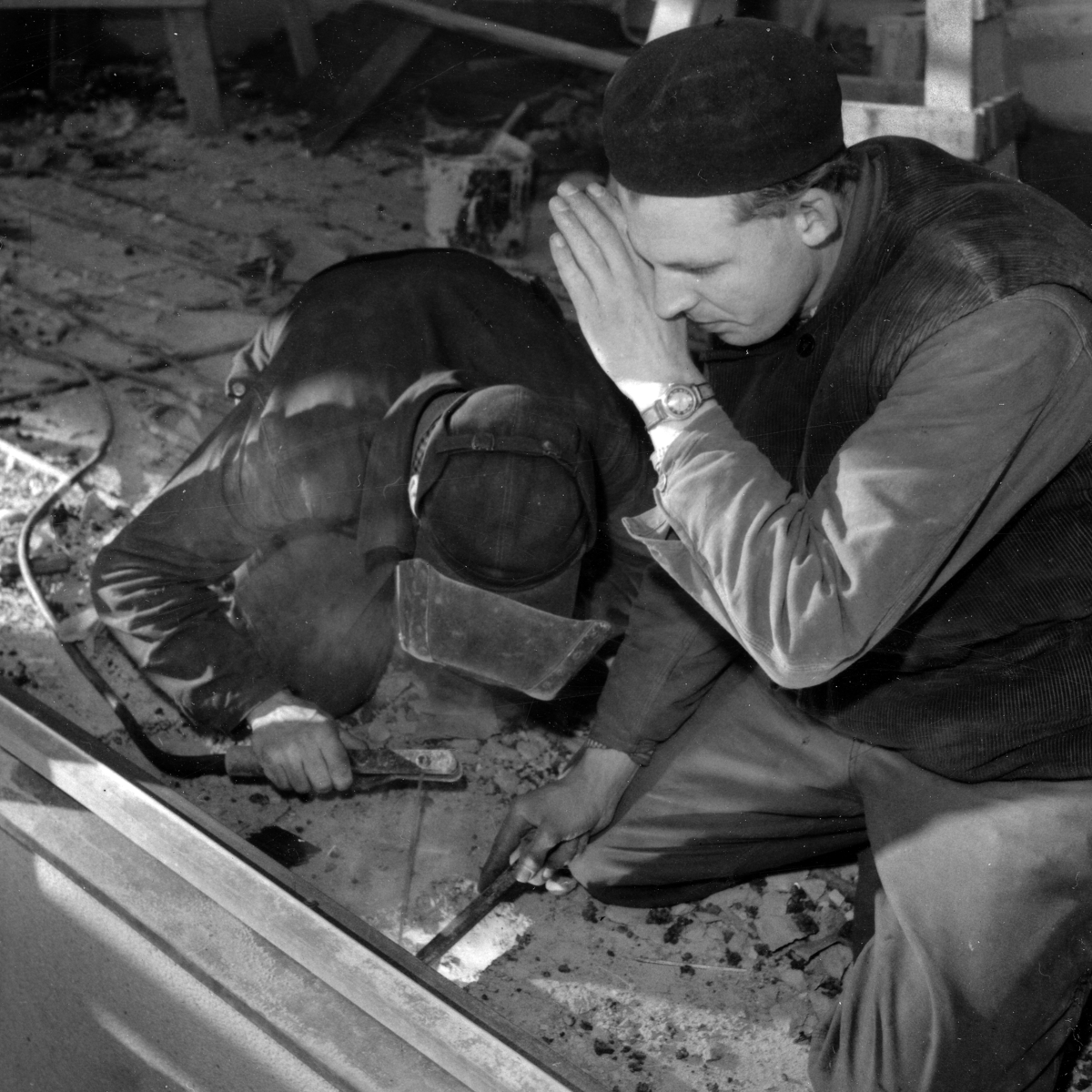 Nya Länsmuseet i Jönköping under uppbyggnad. Idestas arbetare sätter in fönsterkarmarna.