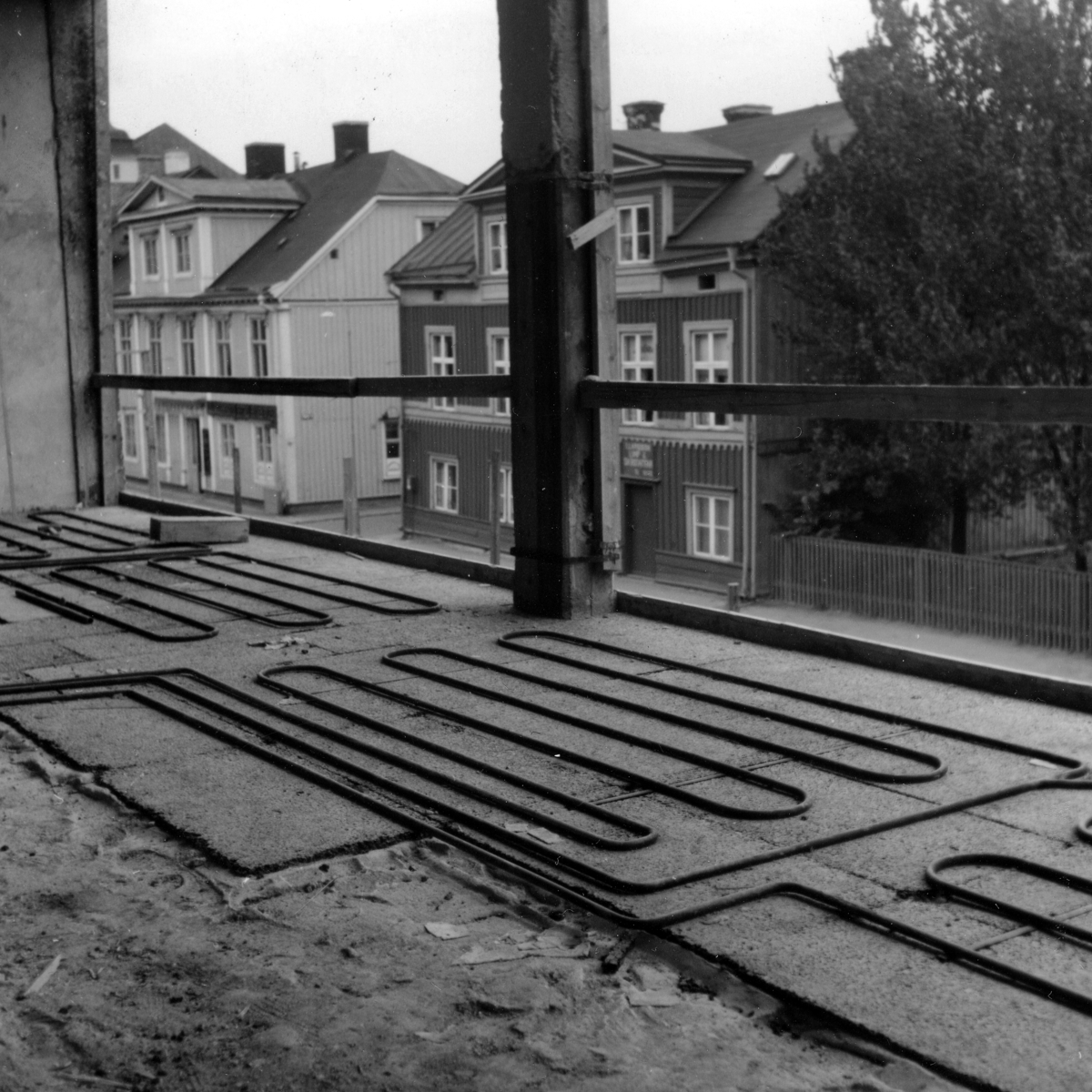 Nya Länsmuseet i Jönköping under uppbyggnad. Värmeslingor i golvet.