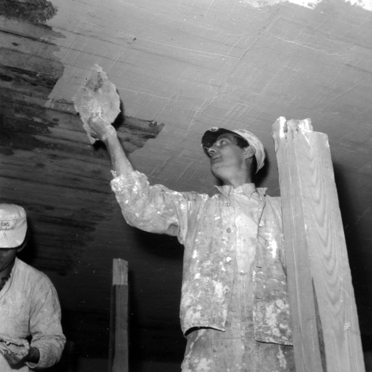 Nya Länsmuseet i Jönköping under uppbyggnad. Spackling av brukshallens tak.