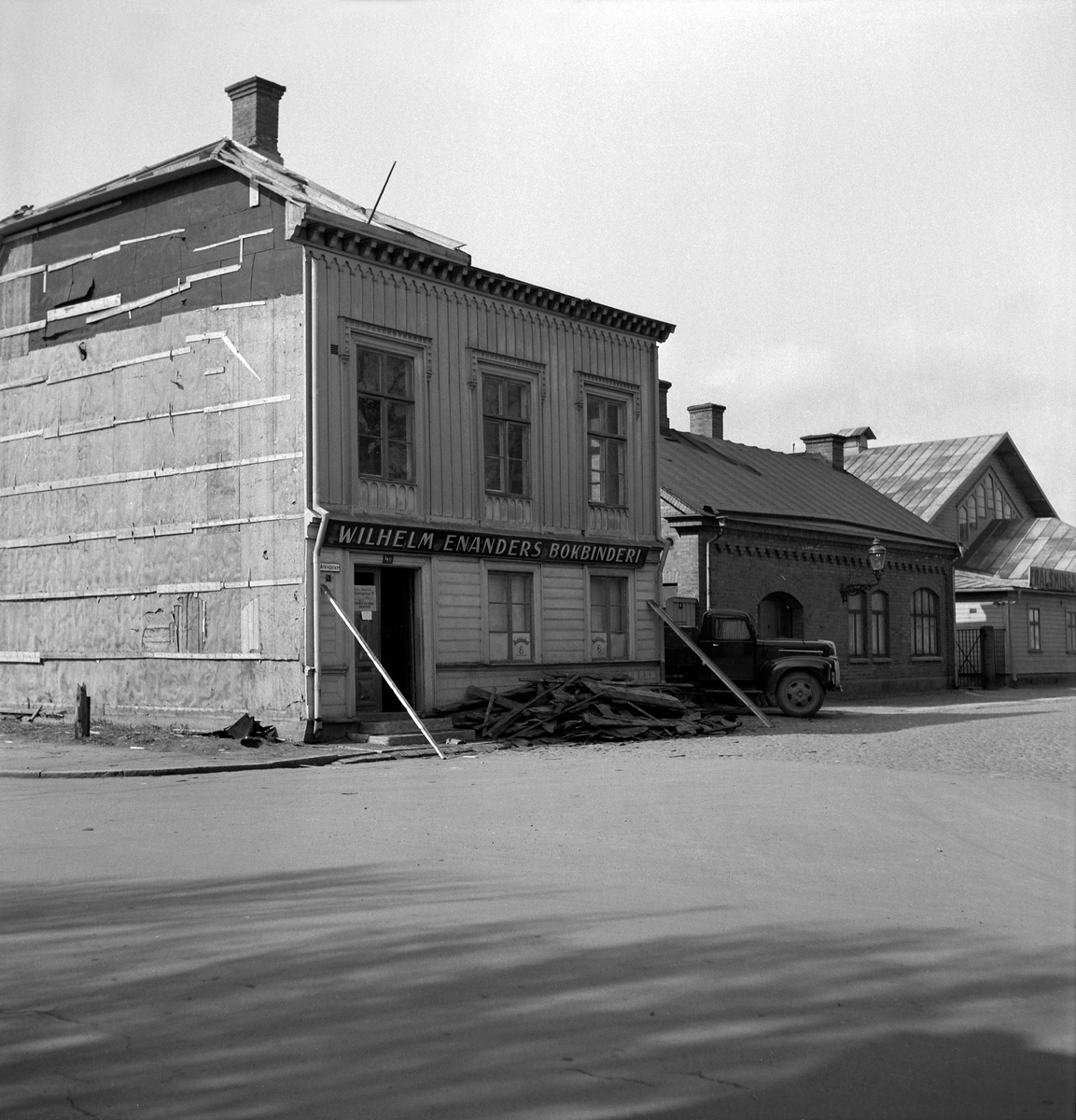 Kvarter Diplomaten i Jönköping med Wilhelm Enanders Bokbinderi år 1953. I bakgrunden skymtar taket Frälsningsarmens tempel, som före år 1897 varit gamla ridhuset.
