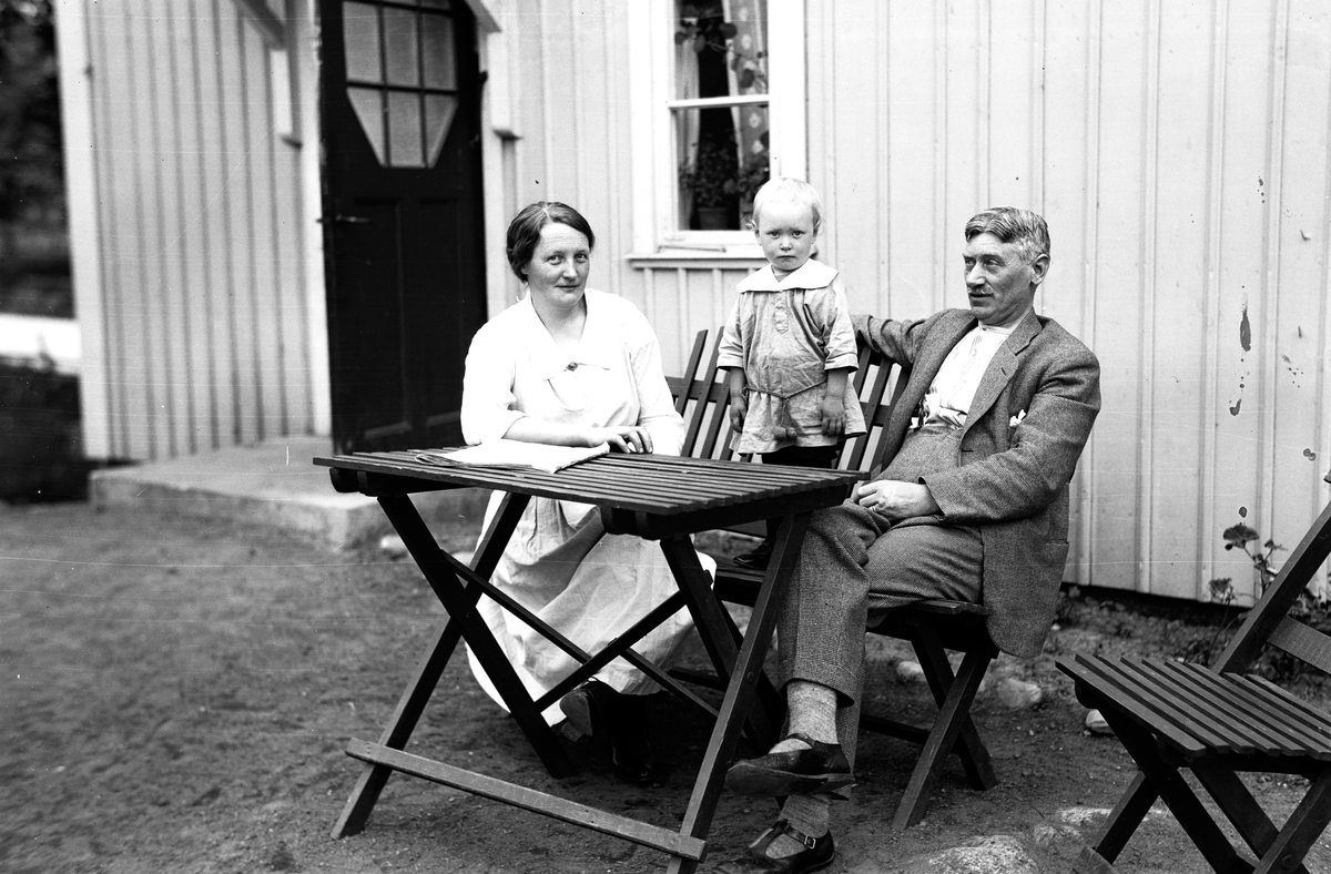 En familj vid trädgårdsmöblerna utanför sitt hem.