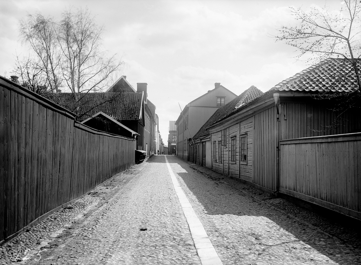 Lantmätargränd i Jönköping från Norra Strandgatan. Nya Biograf-Teatern, som hade sin ingång från gränden, hade öppnat i november 1907. Gränden breddades efter branden 1854.