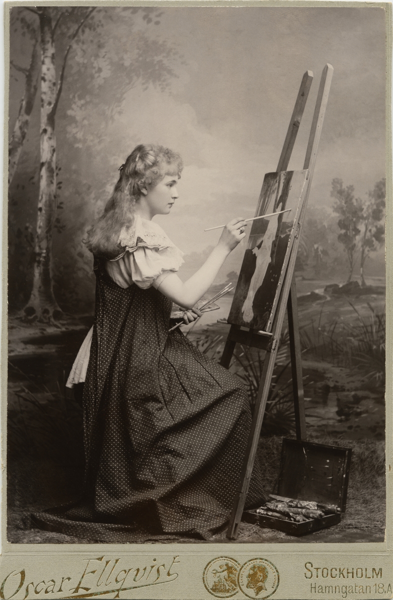 Ett porträtt av Ester Ellqvist-Bauer när hon som 17-åring sitter vid sitt staffli och målar. Bilden blev prisbelönt vid Stockholmsutställningen 1897.