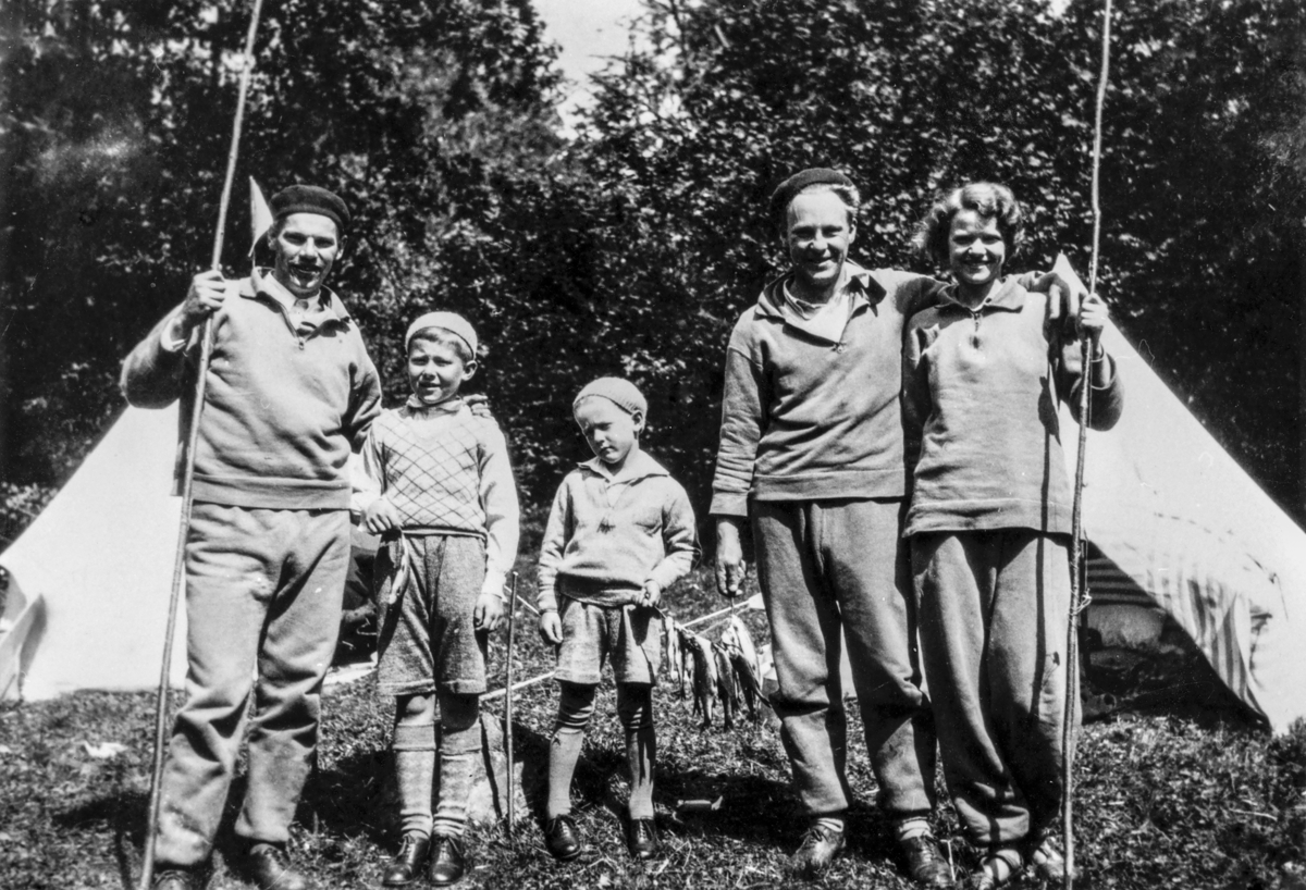 Grupporträtt framför ett par tält. Tältning vid Hocknarp, Järsnäs socken, i samband med förlovningen mellan Hilding Nors och Iris Nilsson 1933. Hilding Nors, Mats Eklund ?, Linnea Danielsson.