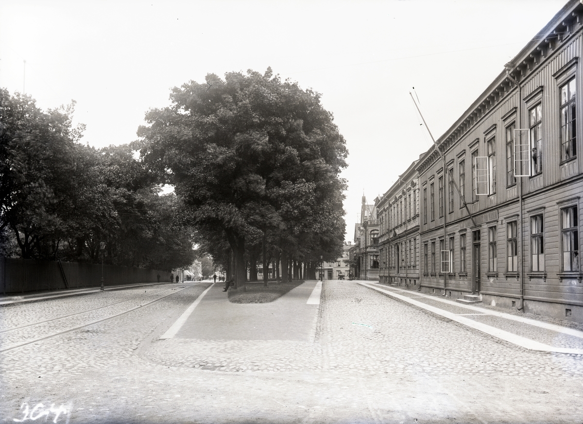 Västra Storgatan mot öster från nr: 21, Santessonska flickskolan i Jönköping. Träden på andra sidan gatan växer i trädgården till Villa Strand, tändsticksfabrikens disponentvilla.