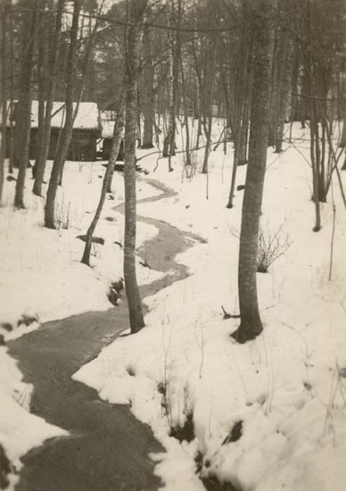 Jönköpings Stadspark på vintern med bäcken som rinner ner mot vattenhjulet.