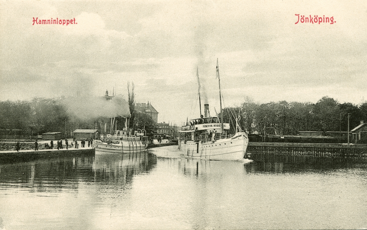 Hamnen i Jönköping med två ångare som passerat Hamnkanalen mellan Munksjön och Vättern, "Viktor Rydberg" till höger och "Södra wettern" till vänster.