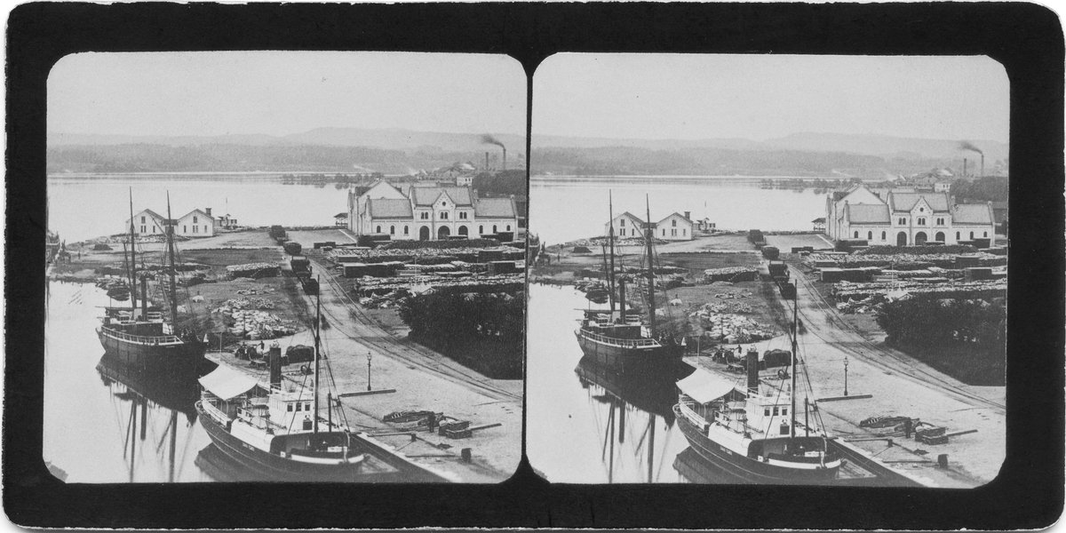 Bilden är tagen från Stora hotellet i Jönköping med utsikt över hamnområdet, tullhuset och Munksjön. Det är ångfartyget ESAIAS TEGNÉR i förgrunden, som byggdes år 1851 för trafiken Jönköping - Stockholm, liksom fem år senare PER BRAHE.